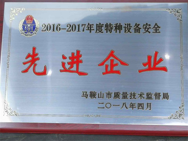 4月18日,和縣皖能蜜芽my77738有限公司受邀參加“2018馬鞍山市特種設備監察暨使用單位落實安全主體責任專(zhuān)項行動動(dòng)員會”,並榮獲“2016-2017年度特種設備(bèi)安全先進企業”榮(róng)譽稱號。