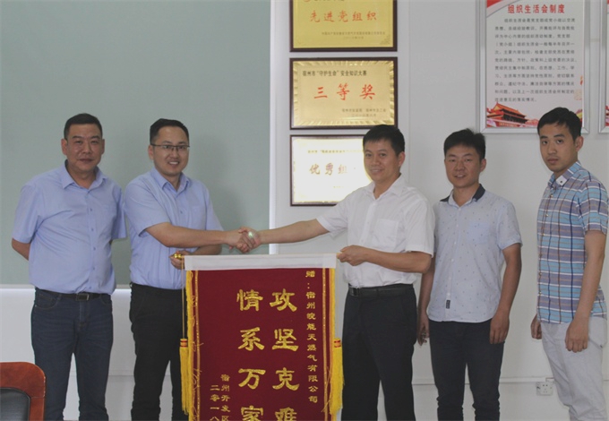 6月12日下午,宿州經濟技術開發區管委會規劃局年立誌主任一行專程(chéng)來到省蜜芽my77738宿州公司,將一麵印有“攻(gōng)堅克難,情係萬家”的錦旗送到了副總經理桂中明手中。