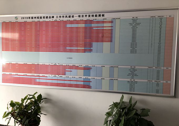 效能展板列明公司所有開發項目的信息收集、預算報價、簽訂合同、設(shè)計(jì)方案、CEA報審(shěn)、投產供氣、財務(wù)決算等18個工作節點,橫跨市場、工程、生產和財務四個部門,貫穿生產經營全過程。展板上明確標明了各責任人及耗用(yòng)時間,每月定(dìng)期公示工作停留的節點和原因,直(zhí)觀反映實際發生的效能問題。為快速應對並切實解決推(tuī)諉、低(dī)效、畏難等影響工作效(xiào)能的問題,公司黨支(zhī)部抽調各部門的黨員同(tóng)誌組成效能先鋒隊,理順相關工(gōng)作機製,協調跨部門溝(gōu)通,整肅工作紀律,富有實效的改善市場開發和(hé)工程(chéng)建設的工作作風。