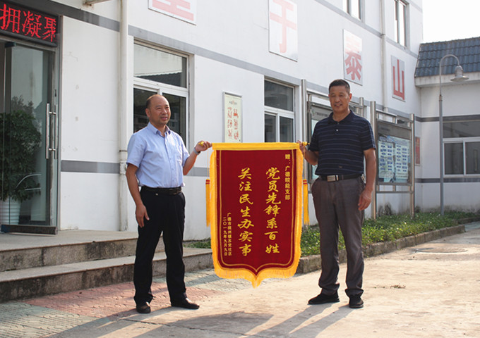 9月16日下午,蘇覺社區黨(dǎng)委委員(yuán)、副書記劉繼祥協同社區代(dài)表將一麵印有“黨員(yuán)先鋒(fēng)係百(bǎi)姓,關注(zhù)民生(shēng)辦實事”的錦旗交至(zhì)廣德皖能黨支部書記陶青福手中,並對支部(bù)用心服務(wù)社區建設表達誠摯(zhì)的(de)謝意。