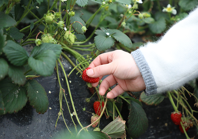 走進草莓(méi)大(dà)棚裏,陣陣草莓清香撲鼻而來(lái),一顆顆鮮紅草莓在綠葉中(zhōng)長勢(shì)喜人,讓人垂涎欲滴。大家拿著籃子,仔細挑選自己心儀的草莓,體驗著采摘的樂趣。