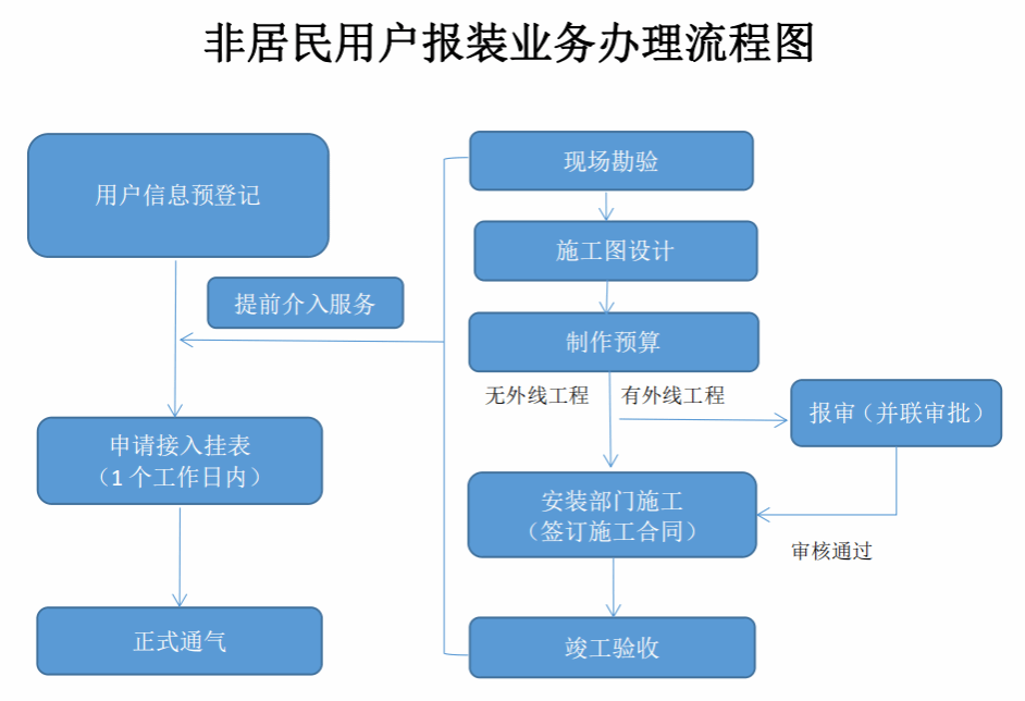 全縣中壓(yā)及以下工商用戶申請燃氣安裝,無外線工程的,受理報裝申請後,1個工作日內完成通氣;有外(wài)線接入的,提(tí)前將用戶信(xìn)息預登記並完成前(qián)期工作,在用戶提交報裝(zhuāng)申請後,預約上門,並在受理(lǐ)後1個工作日內完成通氣。
